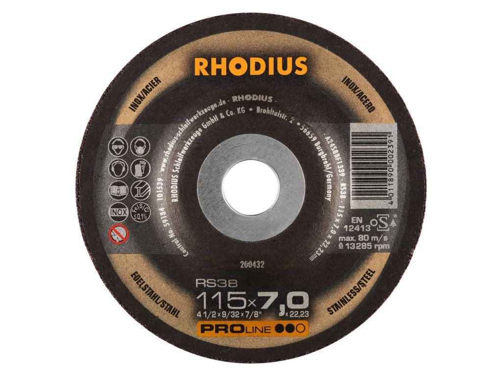 Die RHODIUS RS38 wurde gezielt für die Bearbeitung von Edelstahl (VA-Stahl, Inox), z.B. 1.4301 (X5CrNi18-10 oder 304), Stahl (Schwarzstahl auch Baustahl, St37, S235JR, 1.0037 oder Karbonstahl genannt) und Stahlguss entwickelt. Die Schruppscheibe RS38 eignet sich hervorragend für das Anfasen, für die Schweißnahtvorbereitung, für das Egalisieren von Schweißnähten sowie um Kanten zu brechen und zum Entgraten. Sie ist darüber hinaus auch für den Flächenschliff geeignet.