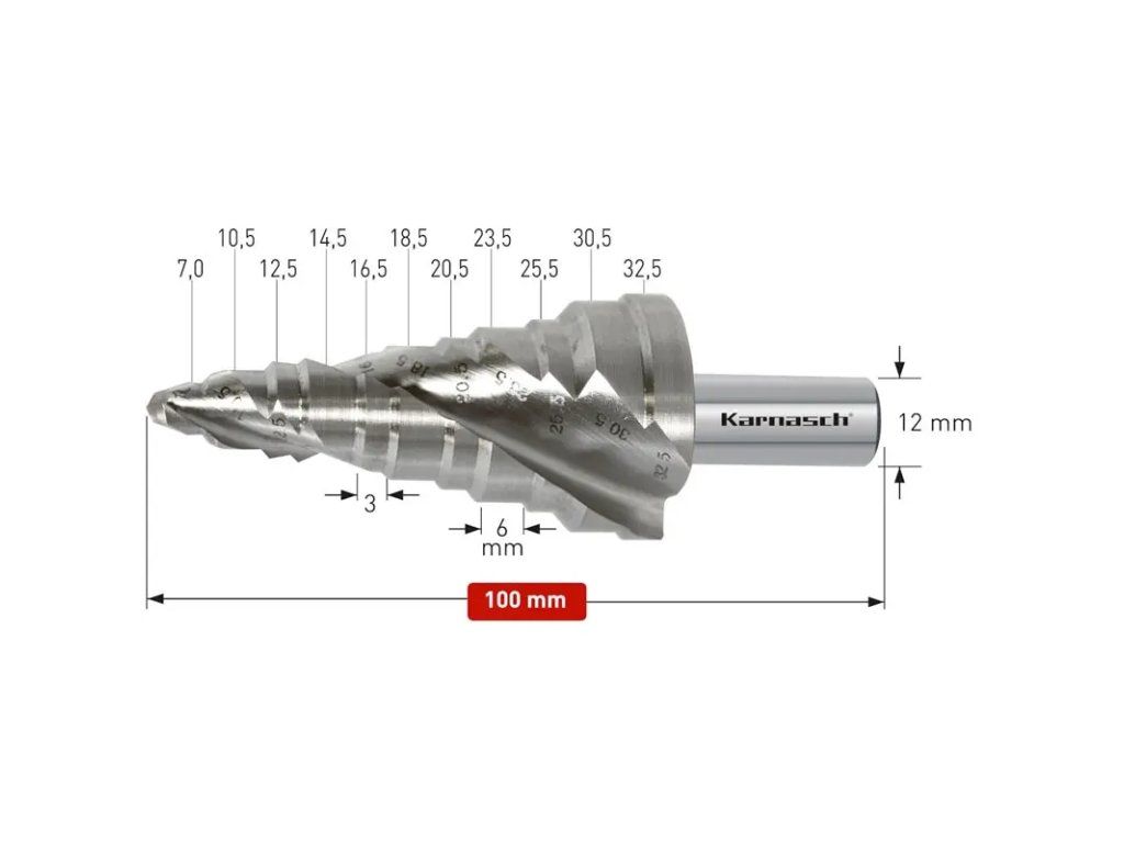 Der Karnasch Professional Stufenbohrer aus HSS-XE Stahl, Spiral genutet mit Kreuzanschliff