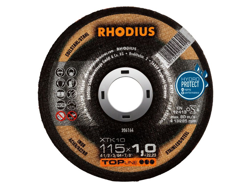In der Anwendung überzeugt die XTK10 durch eine sehr hohe Lebensdauer (Standzeit) auch im Vollschnitt und mit einem besonders aggressiven, leichten und schnellen Schnitt. Auch das präzise Arbeiten in dünnwandigem Material ist kein Problem. Die Scheibe zeichnet sich hier durch geringen Funkenflug, wenig Staubentwicklung und eine hervorragende Laufruhe aus. Sie macht die Arbeit leichter und ist besonders wirtschaftlich. Aufgrund der Kröpfung erreicht die Scheibe eine geringe Winkelabweichung. Dieses RHODIUS Qualitätswerkzeug eignet sich besonders für das Trennen von Baustahl, Werkzeugstahl, Federstählen, dünnwandigen Blechen, rostbeständigem und säurebeständigem Stahl, hochlegiertem Stahl, hochfestem Blech, Kabelschächten, Trägern, Profilen und Platten.