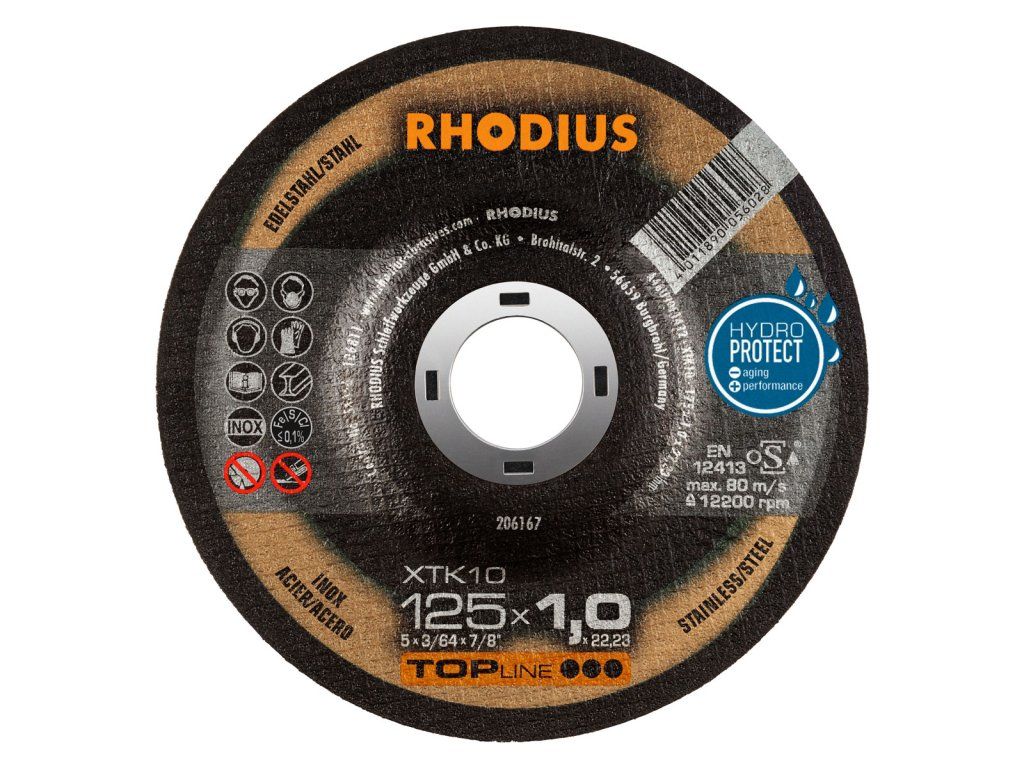 In der Anwendung überzeugt die XTK10 durch eine sehr hohe Lebensdauer (Standzeit) auch im Vollschnitt und mit einem besonders aggressiven, leichten und schnellen Schnitt. Auch das präzise Arbeiten in dünnwandigem Material ist kein Problem. Die Scheibe zeichnet sich hier durch geringen Funkenflug, wenig Staubentwicklung und eine hervorragende Laufruhe aus. Sie macht die Arbeit leichter und ist besonders wirtschaftlich. Aufgrund der Kröpfung erreicht die Scheibe eine geringe Winkelabweichung. Dieses RHODIUS Qualitätswerkzeug eignet sich besonders für das Trennen von Baustahl, Werkzeugstahl, Federstählen, dünnwandigen Blechen, rostbeständigem und säurebeständigem Stahl, hochlegiertem Stahl, hochfestem Blech, Kabelschächten, Trägern, Profilen und Platten.