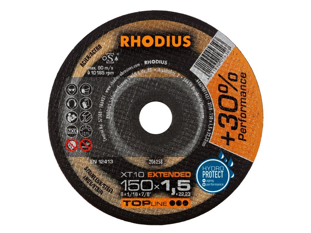 Es handelt sich hier um eine Scheibe in gerader Form (Form 41). Trennscheiben mit gerader Form ermöglichen eine größere Eintauchtiefe und somit auch mehr Schnitte. Die RHODIUS XT10 Scheiben mit dem Durchmesser 230 mm profitieren zudem von der hier eingesetzten RHODIUS EXTENDED Technologie für noch mehr Lebensdauer.