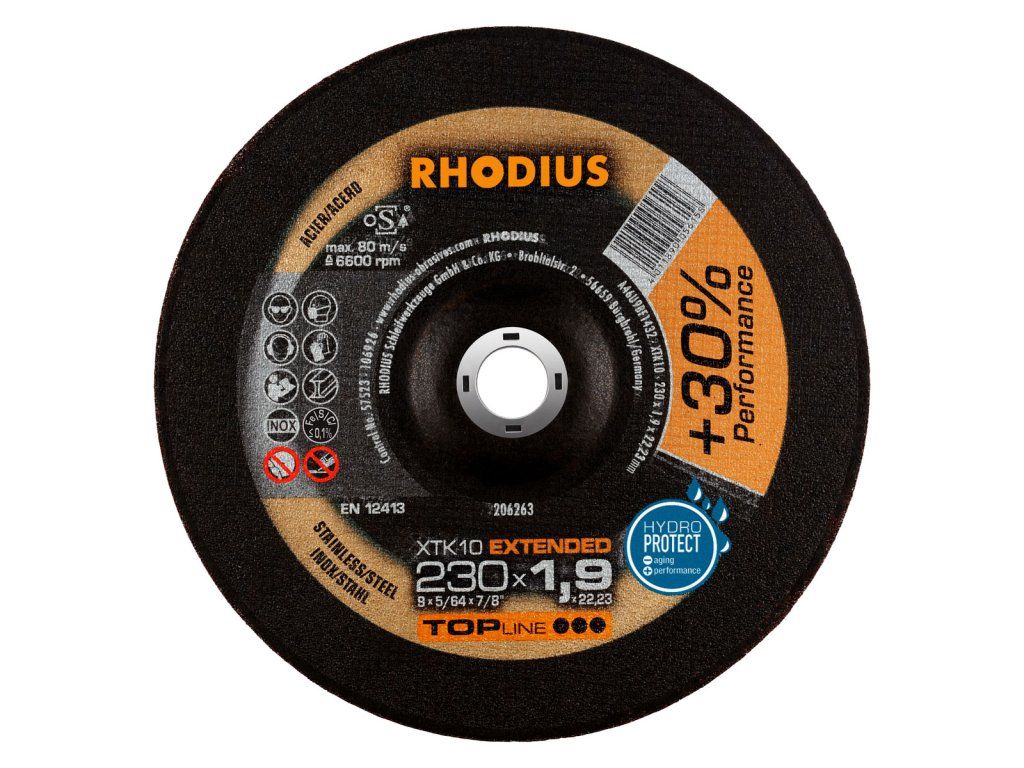 In der Anwendung überzeugt die XTK10 durch eine sehr hohe Lebensdauer (Standzeit) auch im Vollschnitt und mit einem besonders aggressiven, leichten und schnellen Schnitt. Auch das präzise Arbeiten in dünnwandigem Material ist kein Problem. Die Scheibe zeichnet sich hier durch geringen Funkenflug, wenig Staubentwicklung und eine hervorragende Laufruhe aus. Sie macht die Arbeit leichter und ist besonders wirtschaftlich. Aufgrund der Kröpfung erreicht die Scheibe eine geringe Winkelabweichung. Dieses RHODIUS Qualitätswerkzeug eignet sich besonders für das Trennen von Baustahl, Werkzeugstahl, Federstählen, dünnwandigen Blechen, rostbeständigem und säurebeständigem Stahl, hochlegiertem Stahl, hochfestem Blech, Kabelschächten, Trägern, Profilen und Platten.