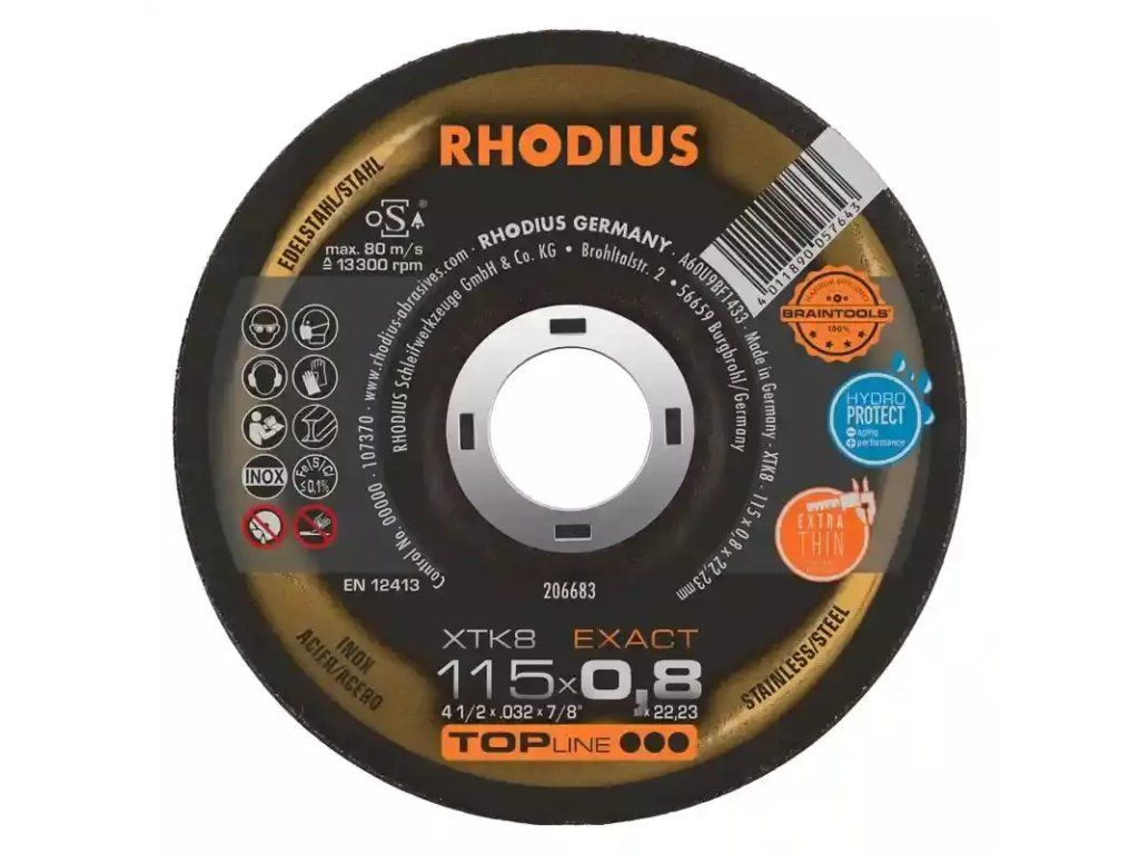 In der Anwendung überzeugt die XTK8 EXACT mit einem besonders leichten und schnellen Schnitt. Die Scheibe zeichnet sich hier durch geringen Funkenflug, wenig Staubentwicklung, eine hervorragende Laufruhe und einer extrem geringen Gratbildung bei einem Minimum an Anlauffarbe am Material aus. Sie macht die Arbeit leichter und ist besonders wirtschaftlich. Präzises und schnelles Arbeiten in dünnwandigem Material ist kein Problem. Aufgrund der Kröpfung erreicht die Scheibe eine geringe Winkelabweichung. Dieses RHODIUS Qualitätswerkzeug eignet sich besonders für das Trennen von Gewindestäben, Baustahl, Federstählen, dünnwandigen Blechen, rostbeständigem und säurebeständigem Stahl, hochlegiertem Stahl, hochfestem Blech, kunststoffbeschichtetem Blech, lackiertem Blech, verzinkten Bauteilen aber auch von Kabelschächten. Dank schmaler Spaltbreiten ist diese Trennscheibe optimal für das MIG-Löten und für Karosseriearbeiten geeignet.