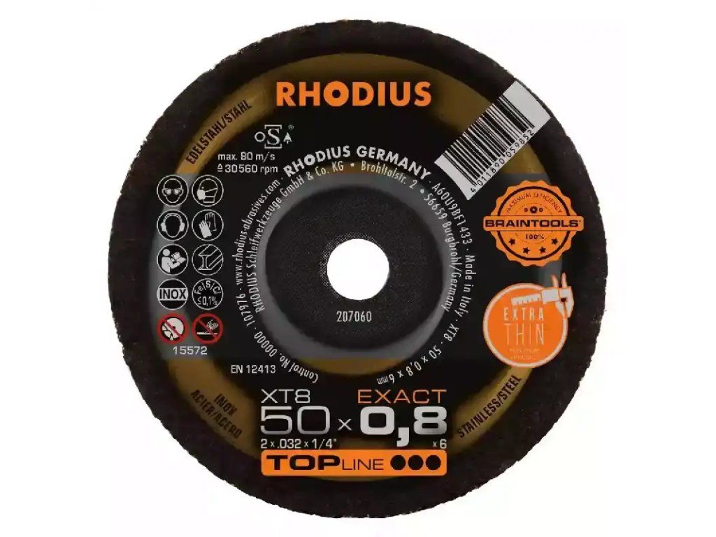 In der Anwendung überzeugt die XT8 EXACT MINI mit einem besonders leichten und schnellen Schnitt. Auch das präzise Arbeiten in dünnwandigem Material ist kein Problem. Die Scheibe zeichnet sich hier durch den geringen Funkenflug, wenig Staubentwicklung, eine hervorragende Laufruhe und einer extrem geringen Gratbildung bei einem Minimum an Anlauffarbe am Material aus. Sie macht die Arbeit leichter und ist besonders wirtschaftlich. Die Scheibe eignet sich sehr gut für das Trennen an schwer zugänglichen Stellen. Dieses RHODIUS Qualitätswerkzeug eignet sich besonders für das Trennen von Federstählen, dünnwandigen Blechen, rostbeständigem und säurebeständigem Stahl, hochlegiertem Stahl, hochfestem Blech, kunststoffbeschichtetem Blech, lackiertem Blech, verzinkten Bauteilen aber auch von Kabelschächten. Dank schmaler Spaltbreiten ist diese Trennscheibe optimal für das MIG-Löten und für Karosseriearbeiten geeignet.