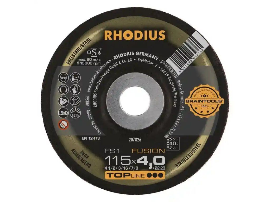 Die RHODIUS FS1 FUSION wurde gezielt für die Bearbeitung von Edelstahl (VA-Stahl, Inox), z.B. 1.4301 (X5CrNi18-10 oder 304), Stahl (Schwarzstahl auch Baustahl, St37, S235JR, 1.0037 oder Karbonstahl genannt) und Stahlguss entwickelt. Die Schruppscheibe FS1 FUSION eignet sich hervorragend für das Kehlnahtschleifen.