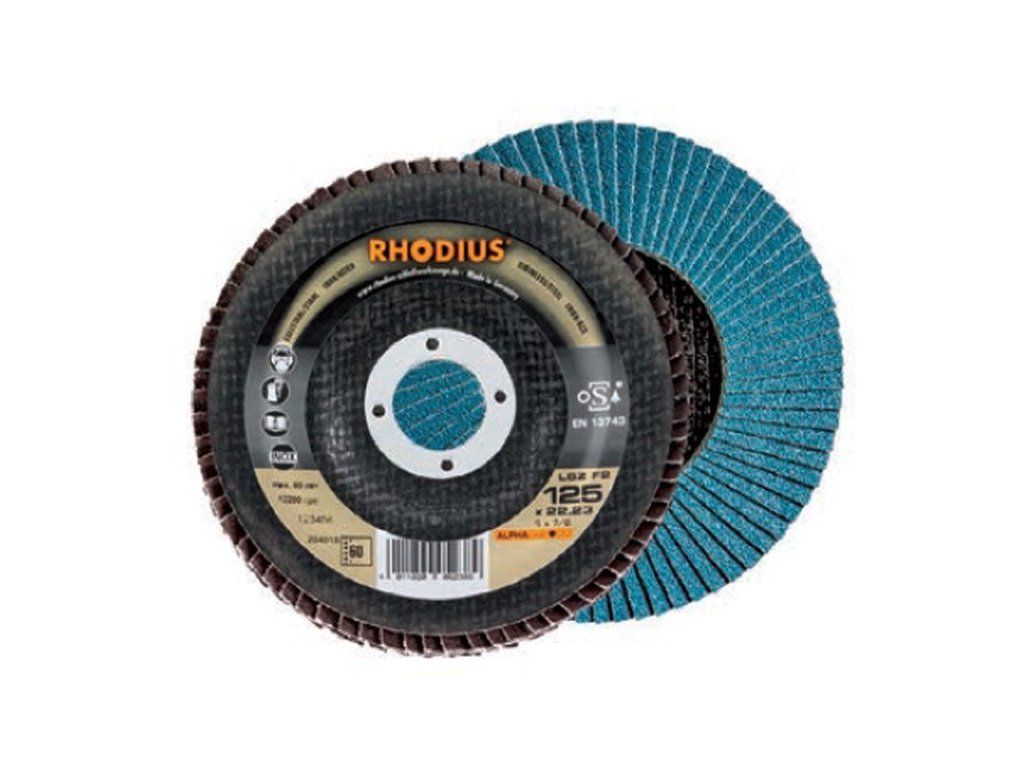 Die Scheibe ist nach EN 13743 hergestellt und sicherheitsgeprüft und zudem oSa-zertifiziert. Sie hat einen Tragteller aus Glasfaser. Der Anwender kann mit hohem Anpressdruck arbeiten. Bei der LSZ F2 wird als Schleifkorn ein hochwertiges Zirkonkorund verwendet. Alle RHODIUS-Lamellenscheiben sind zudem eisen- und schwefelfrei. Die Lamellen liegen bei dieser Scheibe konisch auf. Die konische Anordnung der Lamellen von 10° verbessert die Ergonomie während des Schleifens und erleichtert somit die Handhabung.