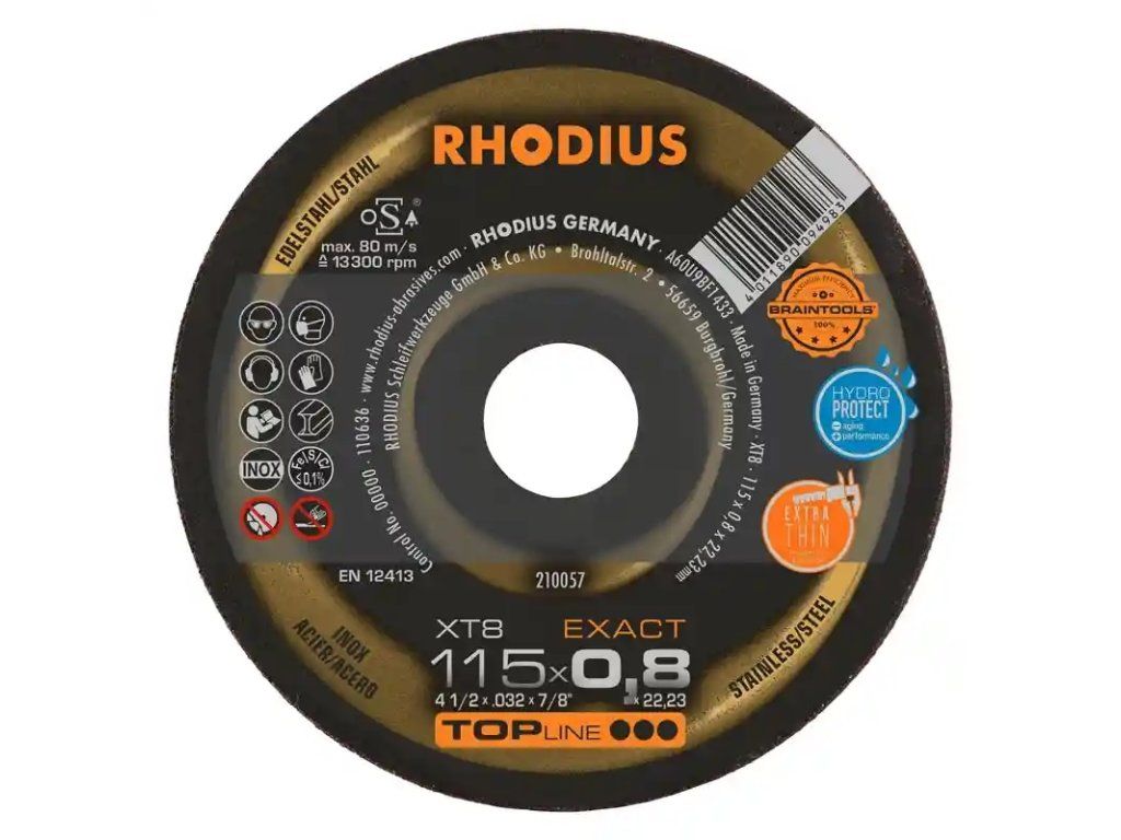 In der Anwendung überzeugt die XT8 EXACT MINI mit einem besonders leichten und schnellen Schnitt. Auch das präzise Arbeiten in dünnwandigem Material ist kein Problem. Die Scheibe zeichnet sich hier durch den geringen Funkenflug, wenig Staubentwicklung, eine hervorragende Laufruhe und einer extrem geringen Gratbildung bei einem Minimum an Anlauffarbe am Material aus. Sie macht die Arbeit leichter und ist besonders wirtschaftlich. Die Scheibe eignet sich sehr gut für das Trennen an schwer zugänglichen Stellen. Dieses RHODIUS Qualitätswerkzeug eignet sich besonders für das Trennen von Federstählen, dünnwandigen Blechen, rostbeständigem und säurebeständigem Stahl, hochlegiertem Stahl, hochfestem Blech, kunststoffbeschichtetem Blech, lackiertem Blech, verzinkten Bauteilen aber auch von Kabelschächten. Dank schmaler Spaltbreiten ist diese Trennscheibe optimal für das MIG-Löten und für Karosseriearbeiten geeignet.
