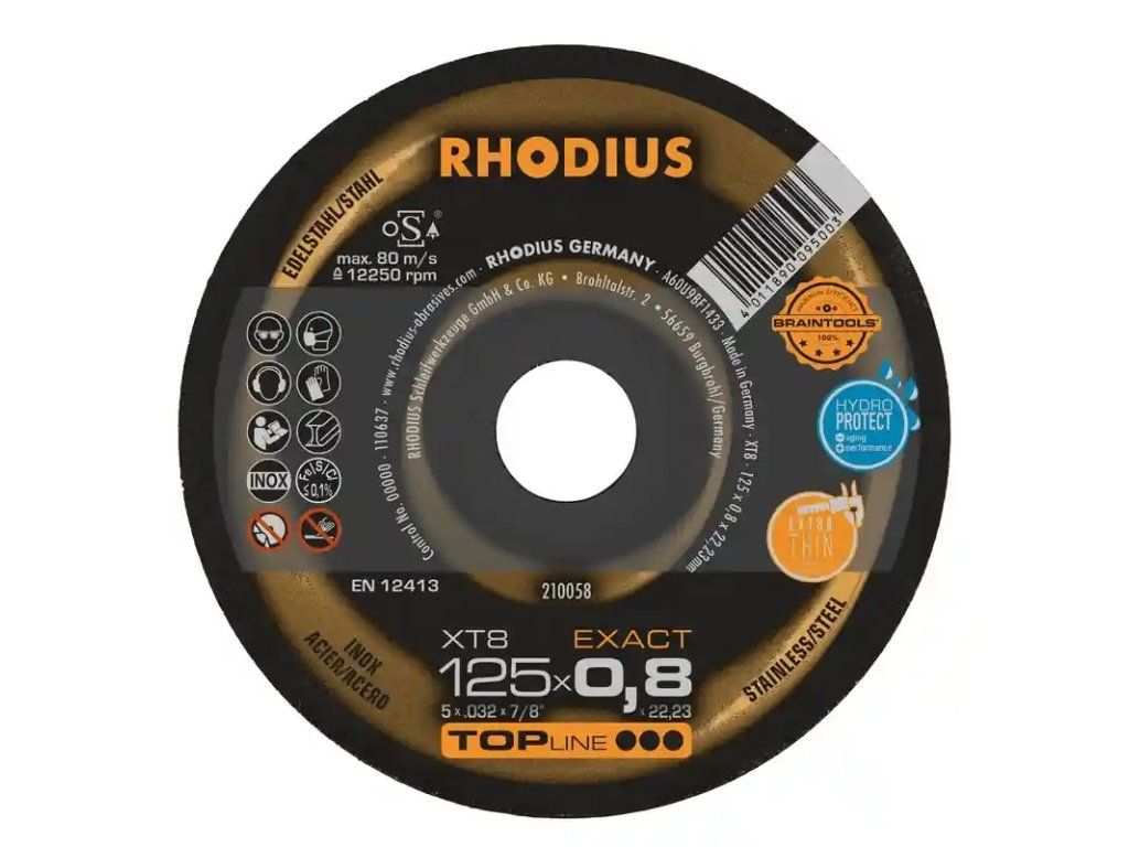 In der Anwendung überzeugt die XT8 EXACT MINI mit einem besonders leichten und schnellen Schnitt. Auch das präzise Arbeiten in dünnwandigem Material ist kein Problem. Die Scheibe zeichnet sich hier durch den geringen Funkenflug, wenig Staubentwicklung, eine hervorragende Laufruhe und einer extrem geringen Gratbildung bei einem Minimum an Anlauffarbe am Material aus. Sie macht die Arbeit leichter und ist besonders wirtschaftlich. Die Scheibe eignet sich sehr gut für das Trennen an schwer zugänglichen Stellen. Dieses RHODIUS Qualitätswerkzeug eignet sich besonders für das Trennen von Federstählen, dünnwandigen Blechen, rostbeständigem und säurebeständigem Stahl, hochlegiertem Stahl, hochfestem Blech, kunststoffbeschichtetem Blech, lackiertem Blech, verzinkten Bauteilen aber auch von Kabelschächten. Dank schmaler Spaltbreiten ist diese Trennscheibe optimal für das MIG-Löten und für Karosseriearbeiten geeignet.
