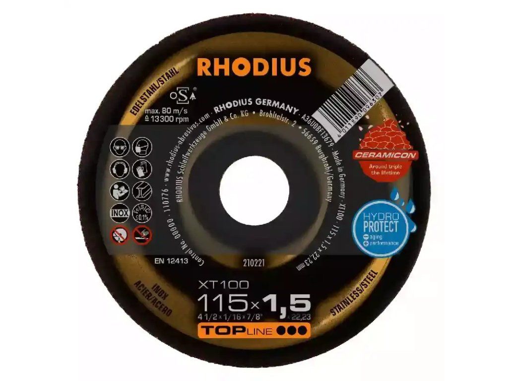 Es handelt sich hier um eine Scheibe in gerader Form (Form 41). Trennscheiben mit gerader Form ermöglichen eine größere Eintauchtiefe und somit auch mehr Schnitte. Die RHODIUS XT10 Scheiben mit dem Durchmesser 230 mm profitieren zudem von der hier eingesetzten RHODIUS EXTENDED Technologie für noch mehr Lebensdauer.