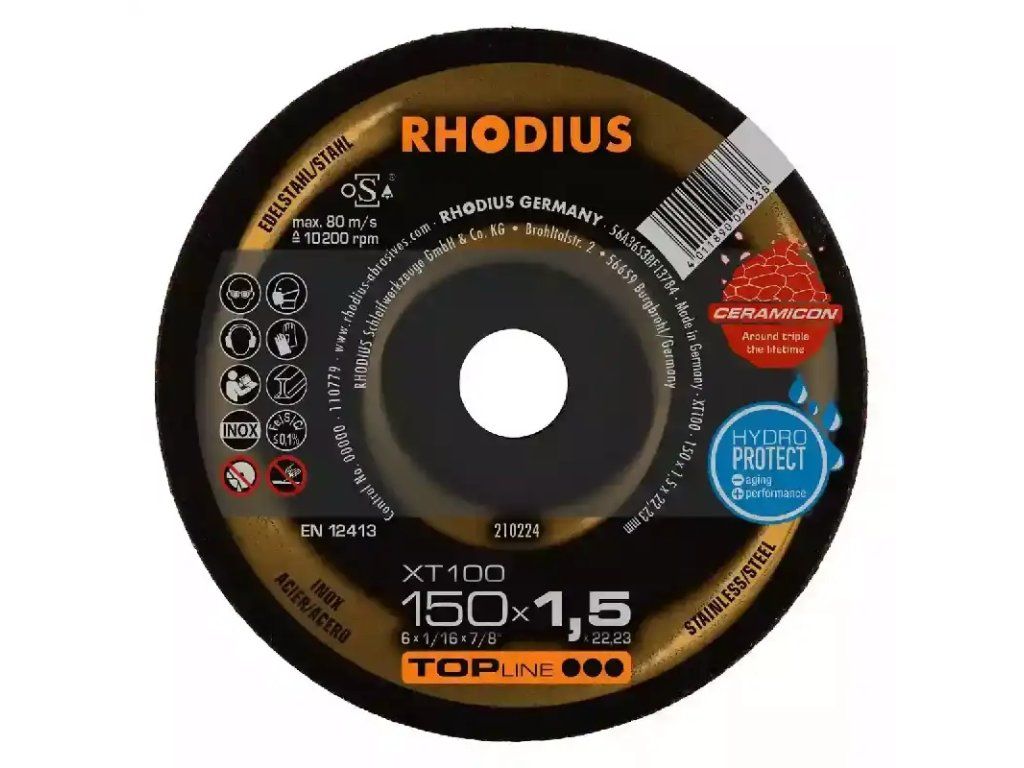 Es handelt sich hier um eine Scheibe in gerader Form (Form 41). Trennscheiben mit gerader Form ermöglichen eine größere Eintauchtiefe und somit auch mehr Schnitte. Die RHODIUS XT10 Scheiben mit dem Durchmesser 230 mm profitieren zudem von der hier eingesetzten RHODIUS EXTENDED Technologie für noch mehr Lebensdauer.