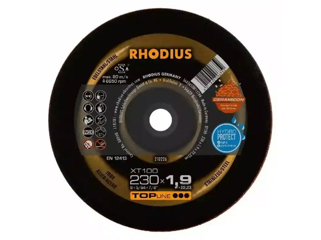 Es handelt sich hier um eine Scheibe in gerader Form (Form 41). Trennscheiben mit gerader Form ermöglichen eine größere Eintauchtiefe und somit auch mehr Schnitte. Die RHODIUS XT10 Scheiben mit dem Durchmesser 230 mm profitieren zudem von der hier eingesetzten RHODIUS EXTENDED Technologie für noch mehr Lebensdauer.