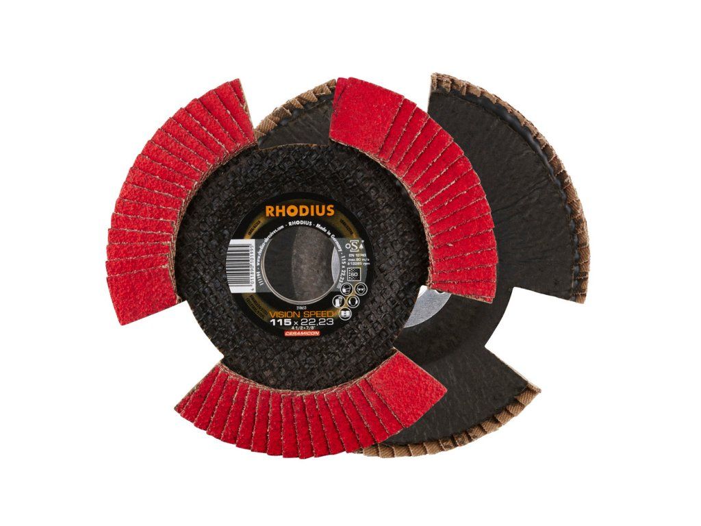 Die Scheibe ist nach EN 13743 hergestellt und sicherheitsgeprüft und zudem oSa-zertifiziert. Sie hat einen Tragteller aus Glasfaser. Der Anwender kann mit hohem Anpressdruck arbeiten. Bei der VISION SPEED wird als Schleifkorn ein hochwertiges Keramikkorn (Sinterkorund) verwendet. Dieses ist selbstschärfend. Alle RHODIUS-Lamellenscheiben sind zudem eisen- und schwefelfrei. Die Lamellen liegen bei dieser Scheibe konisch auf. Die konische Anordnung der Lamellen von 12° verbessert die Ergonomie während des Schleifens und erleichtert somit die Handhabung.