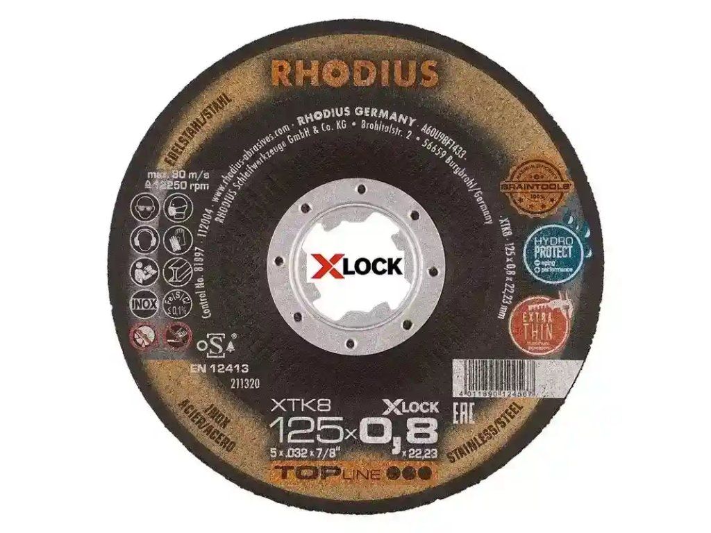 Die extradünne X-LOCK Trennscheibe mit einer Scheibenbreite von 0,8 mm ist in den Durchmessern 115 mm und 125 mm erhältlich und für Winkelschleifer unterschiedlichster Hersteller passend. Alle RHODIUS Scheiben für X-LOCK sind zudem rückwärtskompatibel, das heißt: Sie können auch auf einem herkömmlichen Winkelschleifer mit Aufnahme für eine 22,23 Bohrung genutzt werden.