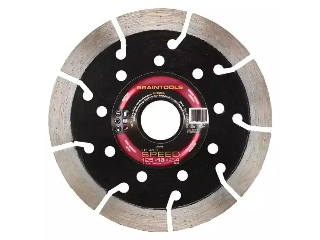 Die LD410 SPEED erreicht mit ihren 17 mm hohen Diamantsegmenten eine extra lange Standzeit in Werkstoffen von Granit bis Beton. Mit der LD410 SPEED lässt sich besonders komfortabel trennen, denn die Vibrationen wurden durch die geschmiedeten Segmente auf ein Minimum reduziert. Der Stahlkern ist zudem mit Kühlungsöffnungen versehen. Sie eignet sich besonders für handgeführte Winkelschleifer, Tischsägen und Benzintrenner. Lasergeschweißt. Für Nass- und Trockenschnitt geeignet.