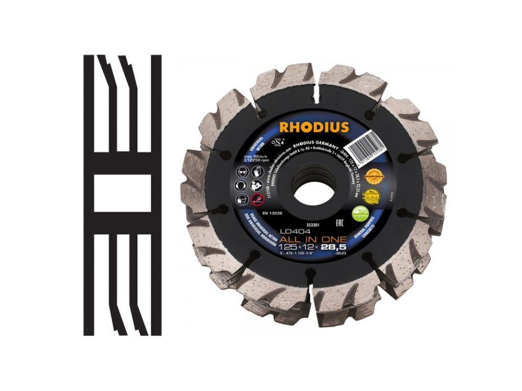 Die LD404 ALL IN ONE besitzt einen segmentierten Schneidrand. Somit wird eine sehr hohe Schnittgeschwindigkeit bei gleichzeitig maximaler Standzeit erreicht. Die Segmente sind zudem verschränkt angeordnet. Das Werkzeug ist nach EN13236 und oSa geprüft und kann im Trockenschnitt eingesetzt werden. Dank der hochwertigen Industriediamanten und einer sehr hohe Diamantkonzentration ist die LD404 ALL IN ONE besonders leistungsstark. Die Scheibe ist zudem lasergeschweißt und bereits komplett montiert.