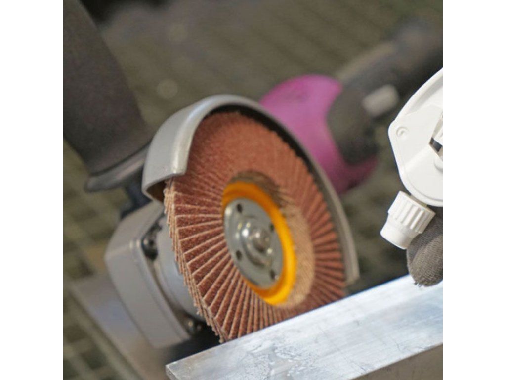 Das einzigartige Spezialöl für die Aluminiumbearbeitung verhindert das „Zuschmieren“ der Fächerschleifscheiben.