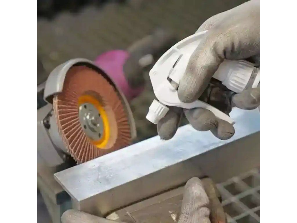 Das einzigartige Spezialöl für die Aluminiumbearbeitung verhindert das „Zuschmieren“ der Fächerschleifscheiben.
