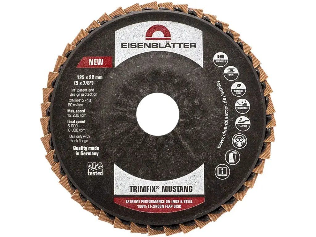 Die TRIMFIX® MUSTANG® Fächerschleifscheibe wird ebenfalls nur auf den exklusiv bei Eisenblätter erhältlichen Naturfaser-Compound Trägertellern ausgeliefert und erhält dadurch viele weitere, wichtige Vorteile.